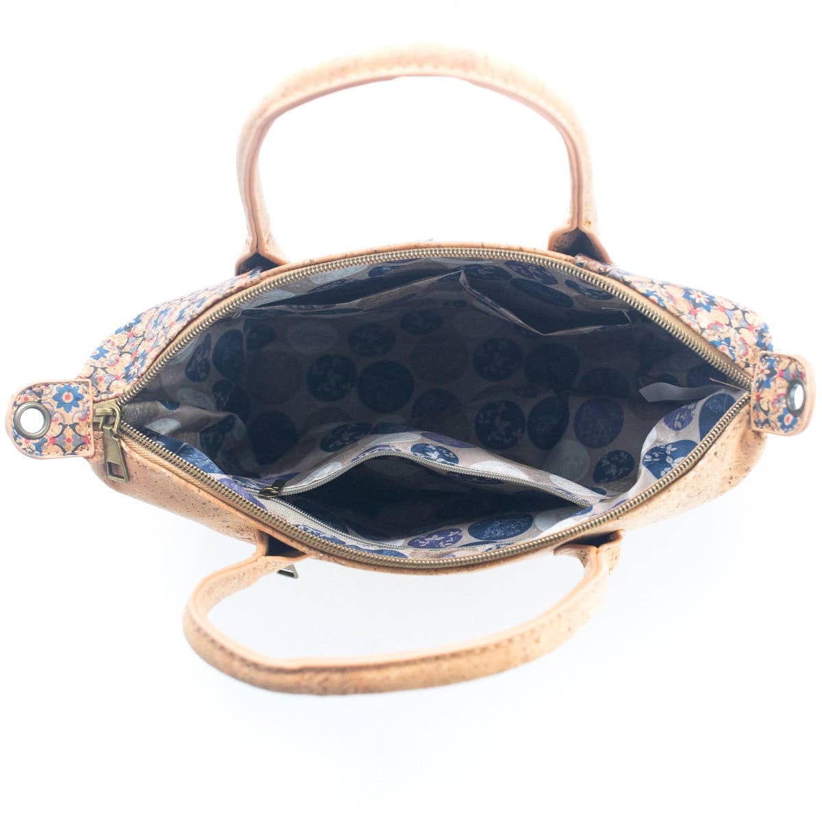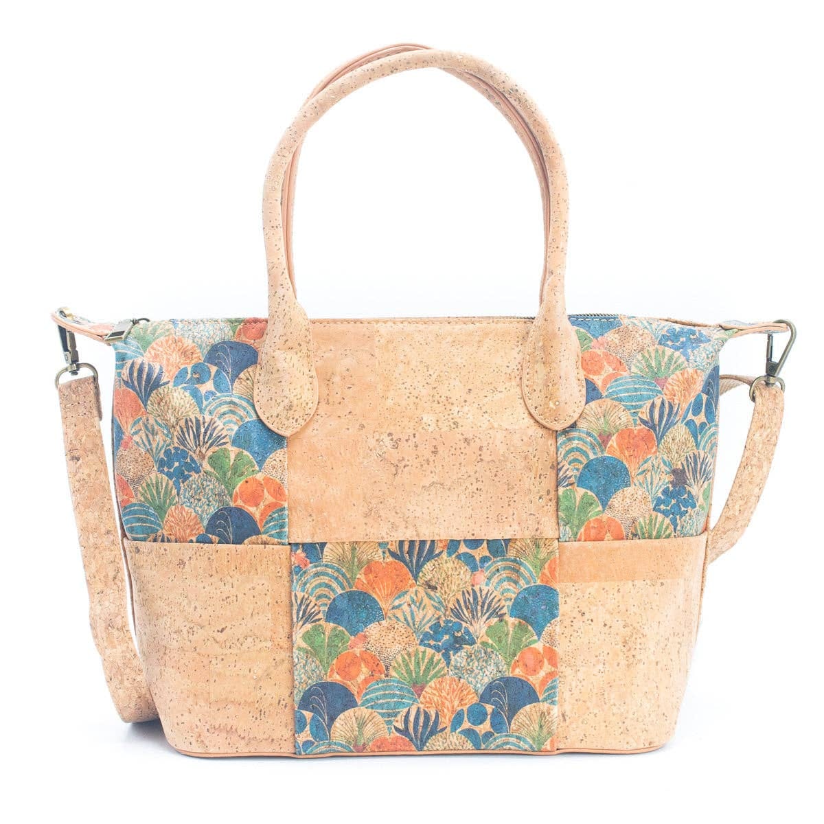 Представяме ви нашата зашеметяваща дамска чанта тип Tote от естествен корк с пъстър дизайн. Тази изискана чанта е изработена от изцяло естествен корк и разполага с уникална предна част, съставена от множество парчета, безпроблемно комбинирани едно с друго. Обратната страна на чантата включва удобен джоб с цип, който ви позволява сигурно да съхранявате вещите си, докато сте в движение. Вътре в чантата ще намерите добре проектирани отделения, включително разделен слой и специални слотове за мобилен телефон и карти.