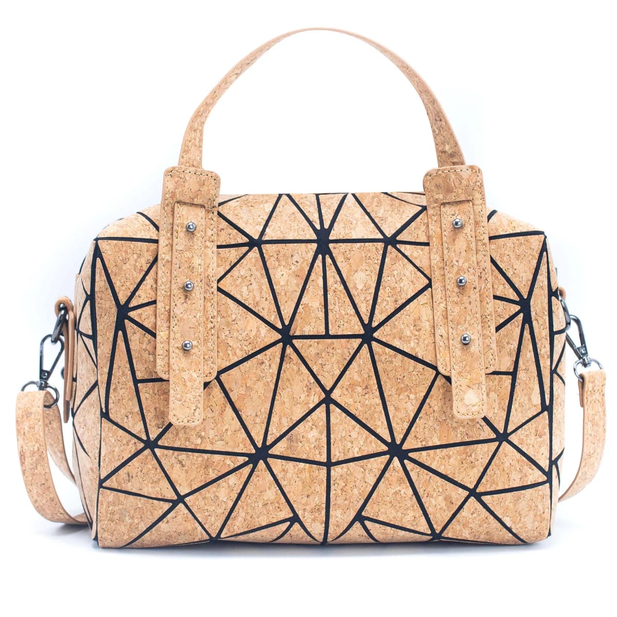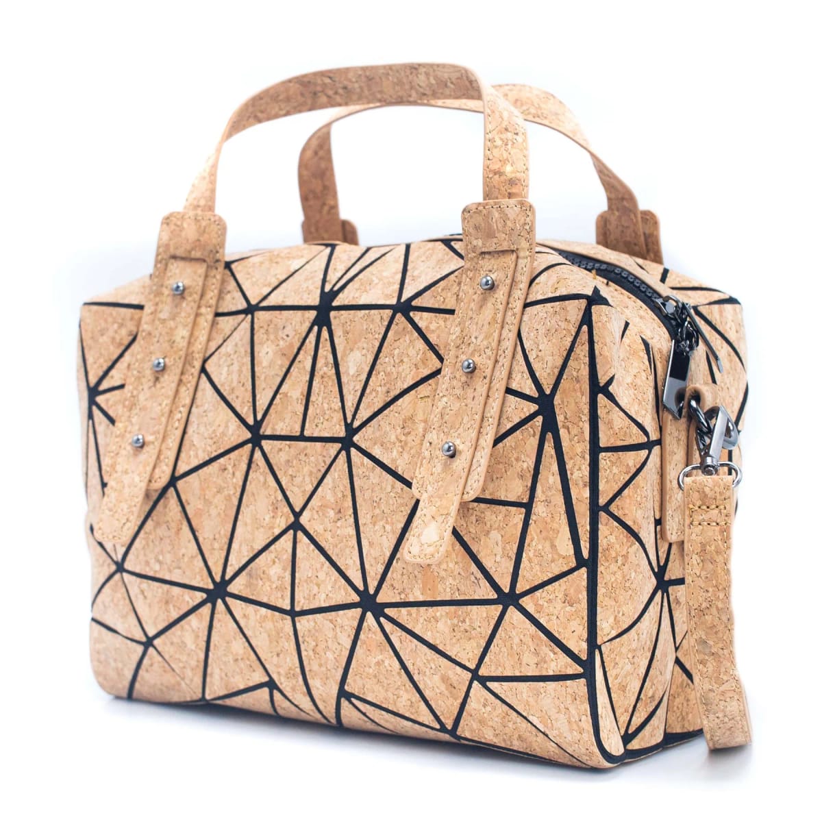 Дамска чанта от геометричен корк, стилен и универсален аксесоар, който съчетава мода и функционалност. Тази чанта се отличава с уникален геометричен дизайн, който я прави различна от останалите. Чантата е снабдена с здрави дръжки, закрепени с нитове, което осигурява удобен захват с ръка. Освен това разполага с подвижни презрамки за рамо, които ви дават възможност да я носите както в ръка, така и през тялото. Вътре ще намерите разделени секции, перфектни за съхранение на телефона и ключовете ви. Има и отделен вътрешен джоб с цип за допълнително удобство. Подчертайте стила си с този еко приятелски и модерен аксесоар, който лесно преминава от ръчен режим на носене до през рамо.