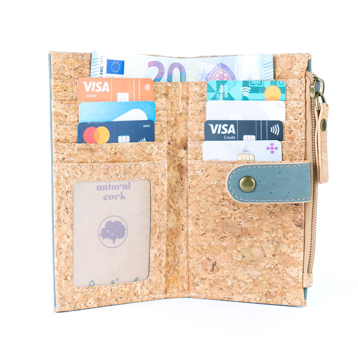 Стилен дамски портфейл изработен от висококачествен корк. Този портфейл може да побре до 8 кредитни карти, банкноти и монети. . Размерите на това портмоне са идеално пригодени за ежедневно ползване, 9 см височина, 2 см ширина и 16 см дължина. Компактният му размер, в комбинация с естествената гъвкавост и здравина на корка, го прави перфектен спътник за вашата чанта.