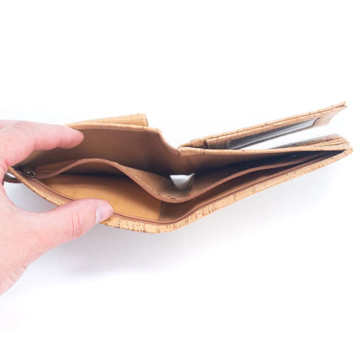 Портфейл от естествен корк за мъже, който е удобен за носене в предния джоб. Побира 8 банкови карти, +1 лична карта, както и джоб за монети с тик-так копче. Стилен, семпъл и издръжлив.